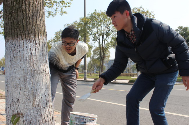 因冬夏季树木在室外将会遭遇虫害及受冻而导致树木生命力缩短导致提前枯萎,学生们决定为我院的树木涂上石灰,使所有的树木能在冬夏季避免冻害及虫害。活动期间,老师和同学们表现出极大的热情。一到粉刷地点就放下石灰桶,因对刷树步骤不熟悉,最初均出现了一些“漏刷”“多刷”的情况,经过后勤老师的讲解,并配合自身理解,逐渐的可以熟练地进行刷树活动。大家情绪高涨,又一丝不苟,透着一股认真的“专业”劲儿,时不时互相交流作业的经验和技巧。经过近一小时热火朝天的劳动,校园道路焕然一新,周围的树木已都穿上了自己的“新衣”。