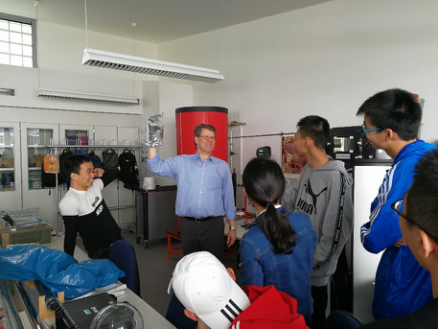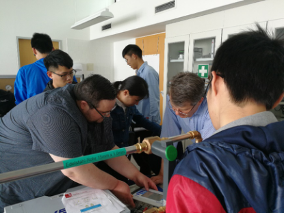 在Paktikum Energietechnik课上,Arlt教授把我们12个人分成了2个小组,一组由他的助教教学、陈煜敏老师做翻译,一组由Alrt教授教学。Alrt教授先是给我们讲解了天然气输送的基本知识和实验设备的使用,紧接着就让我们自己做实验,通过实验来找到答案。在我们多次试验之后,经过小组内的讨论,最终成功找到天然气输送的最佳输送方式。之后我们进行第二个项目如何检测天然气泄漏,并学会使用超声波播探测仪来检测。