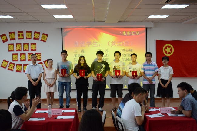 2017年6月21日中午,中德工程学院团员青年圆桌论坛暨五四表彰大会,在I-403教室正式开展。参加本次活动的领导有:团委组织部部长万晶老师,党总支副书记、副院长蔡林洁老师,团总支书记、易班工作站指导老师张姝老师,以及辅导员老师们:严卫华老师,张晶老师,汝勇老师,徐济陆老师。