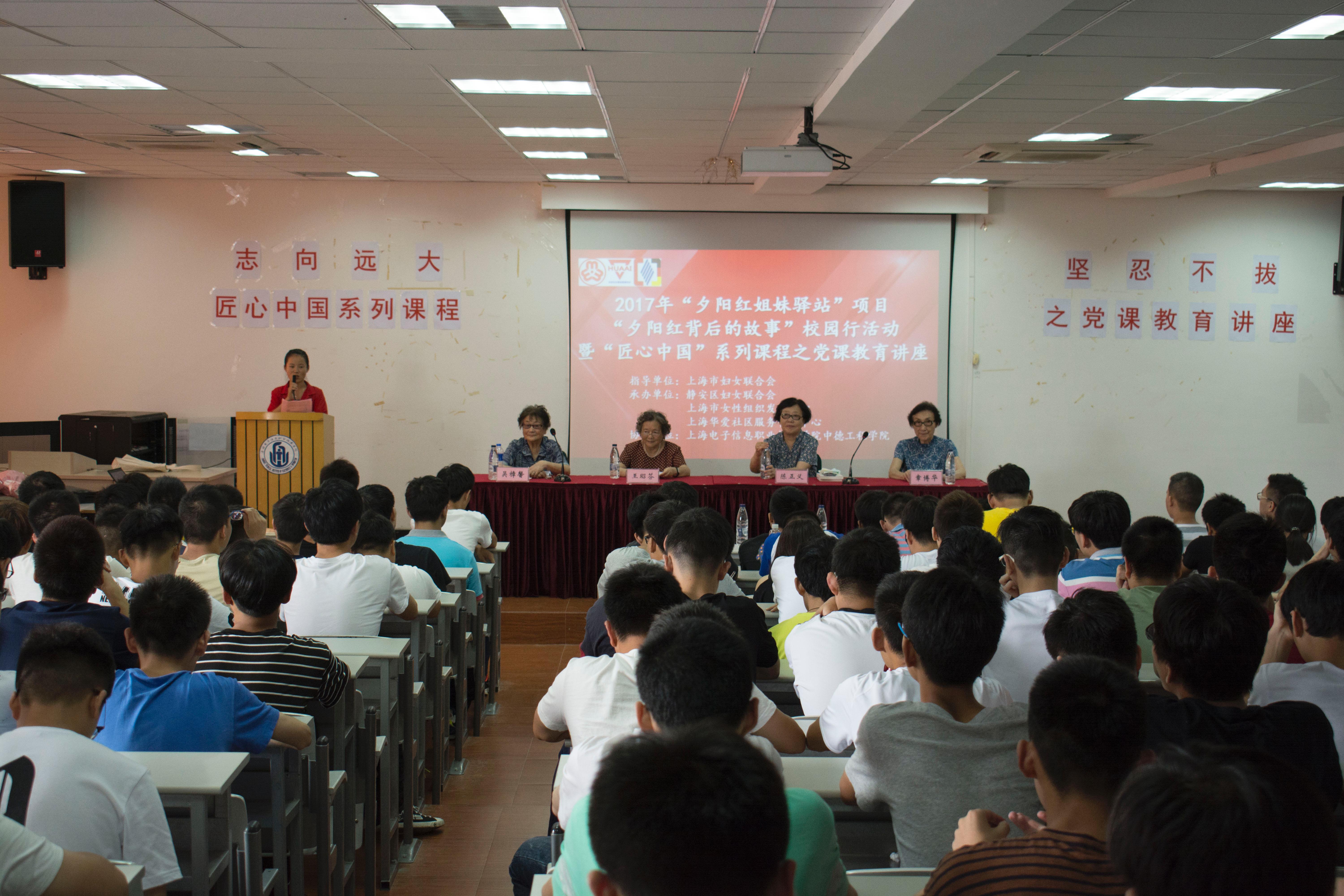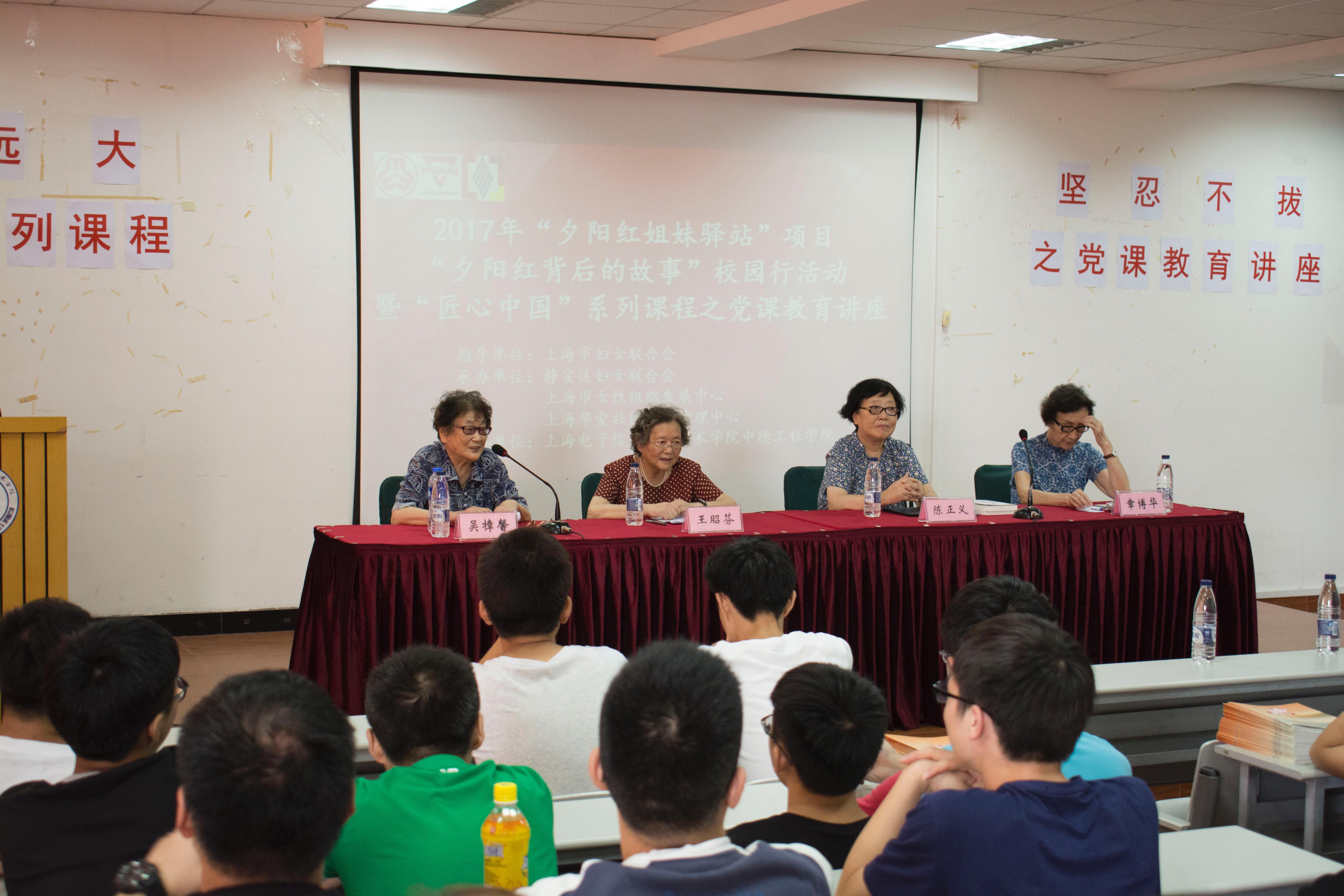 2017年9月19日下午13:00,志向远大,坚忍不拔—“匠心中国”系列课程之党课教育讲座在I402教室展开。中德工程学院有幸迎来4位“夕阳红姐妹驿站”的老三八红旗手吴樟馨、章博华、王昭芬、陈正义,为2017级全体中德工程学院新生带来党课教育讲座。本次讲座由中德工程学院团总负责人张晶老师主持。