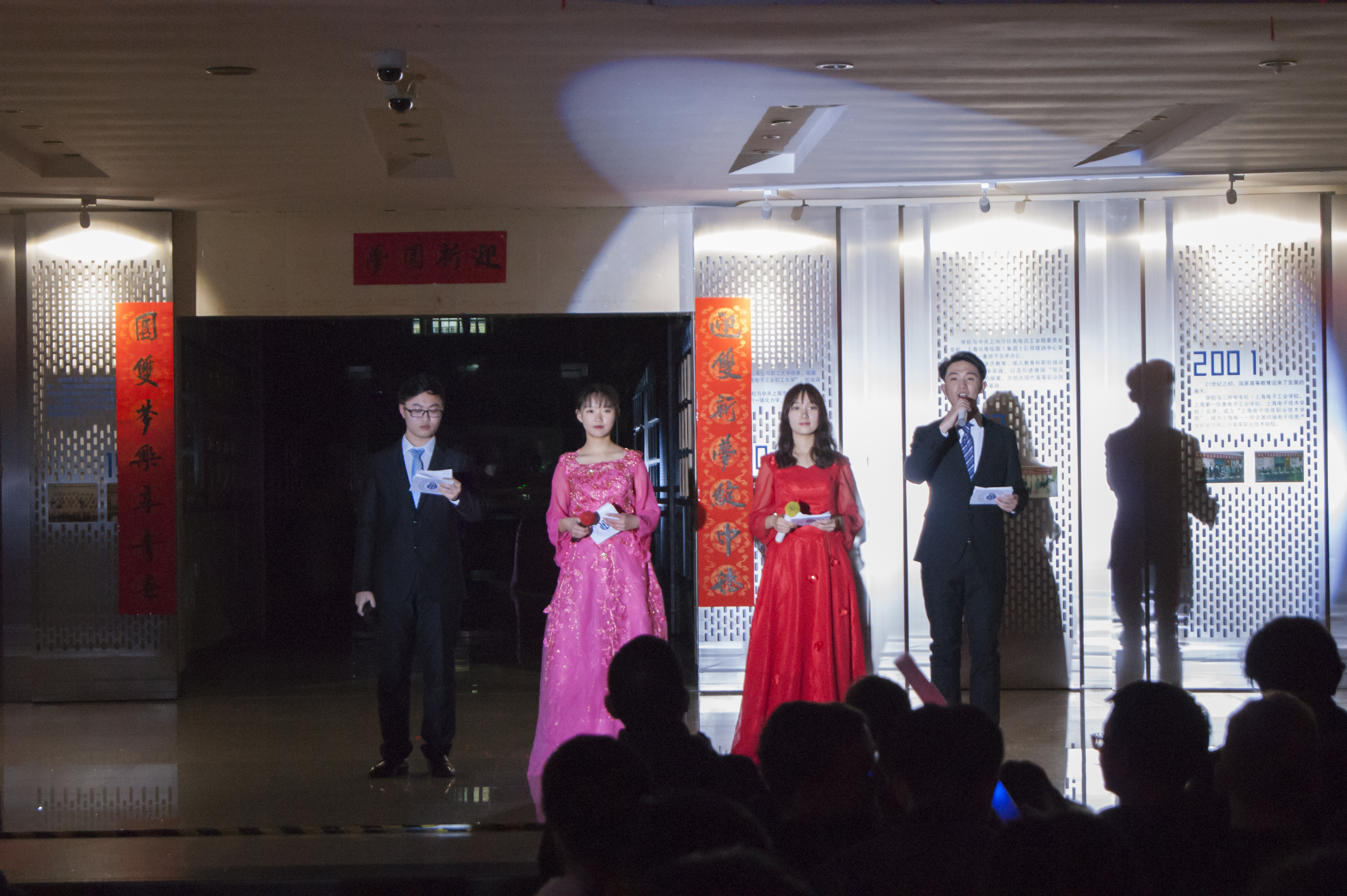 2017年12月28日晚17:00,上海电子信息职业技术学院中德工程学院、外语学院“梦绽中国殿,乐享青春宴”双迎新晚会在中德B楼大厅隆重举行。出席本次晚会活动的老师有外语学院党总支副书记吴亚人老师、中德工程学院学生管理办公室主任梁咏梅老师、中德工程学院团总支书记张晶老师、设计与技术学院团总支书记马春杰老师、机械与能源工程学院仲召婷老师、辅导员汝勇老师和武祥达老师以及各二级学院学生代表。