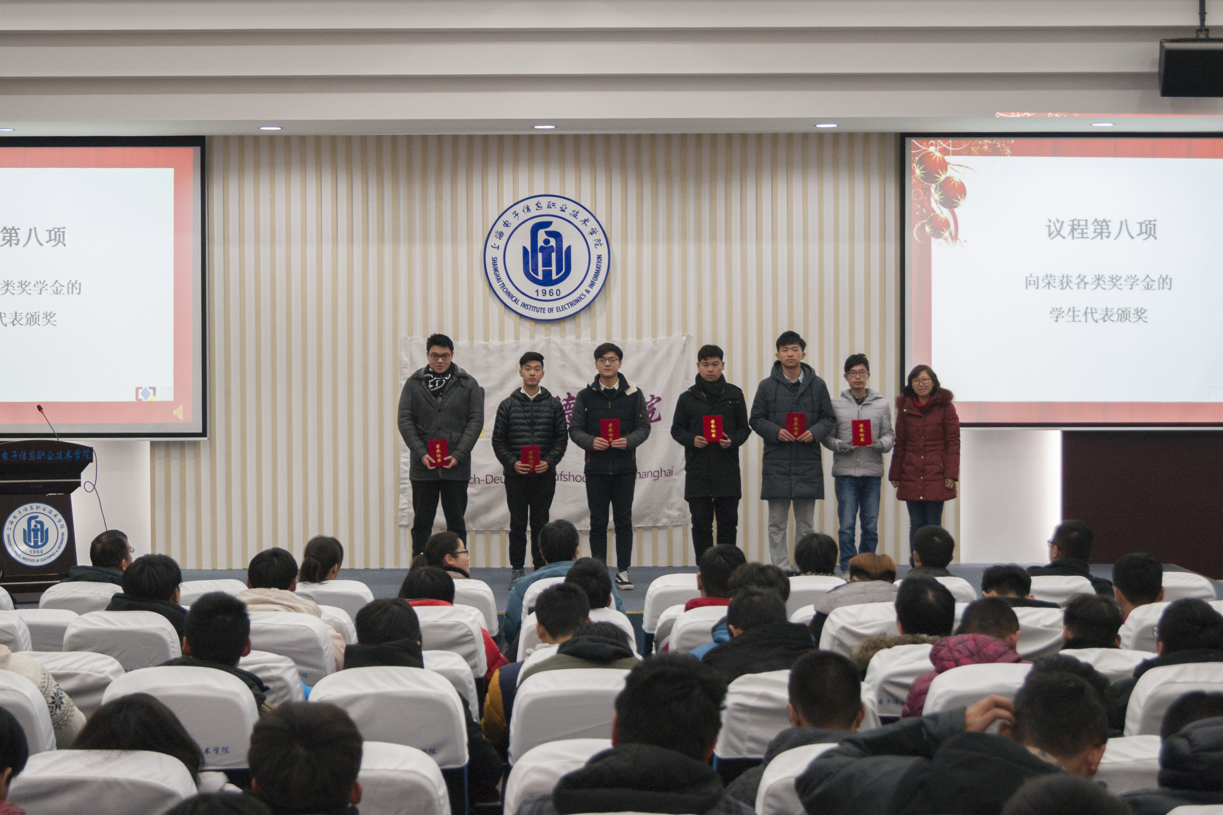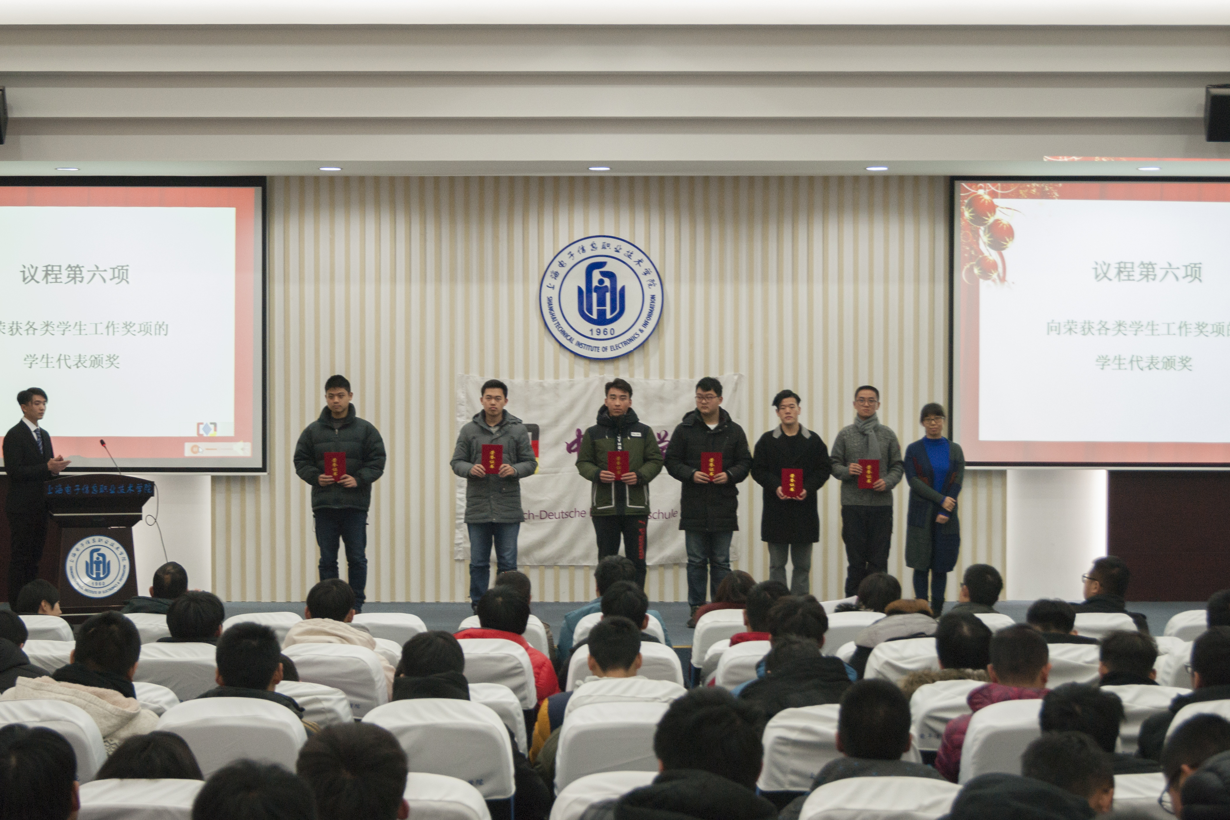 为表彰先进,推进十九大精神在我院的全面贯彻与落实。2018年1月11日中午,中德工程学院在C108 报告厅隆重举行2017年度学生工作总结表彰大会。中德工程学院院长林军老师,党总支副书记、副院长蔡林洁老师,副院长张峻颖老师,学生管理办公室主任梁咏梅老师,学生党支部书记、学院办公室主任施云美老师,团总支书记张晶老师,辅导员徐济陆老师、汝勇老师、严卫华老师、武祥达老师出席会议。