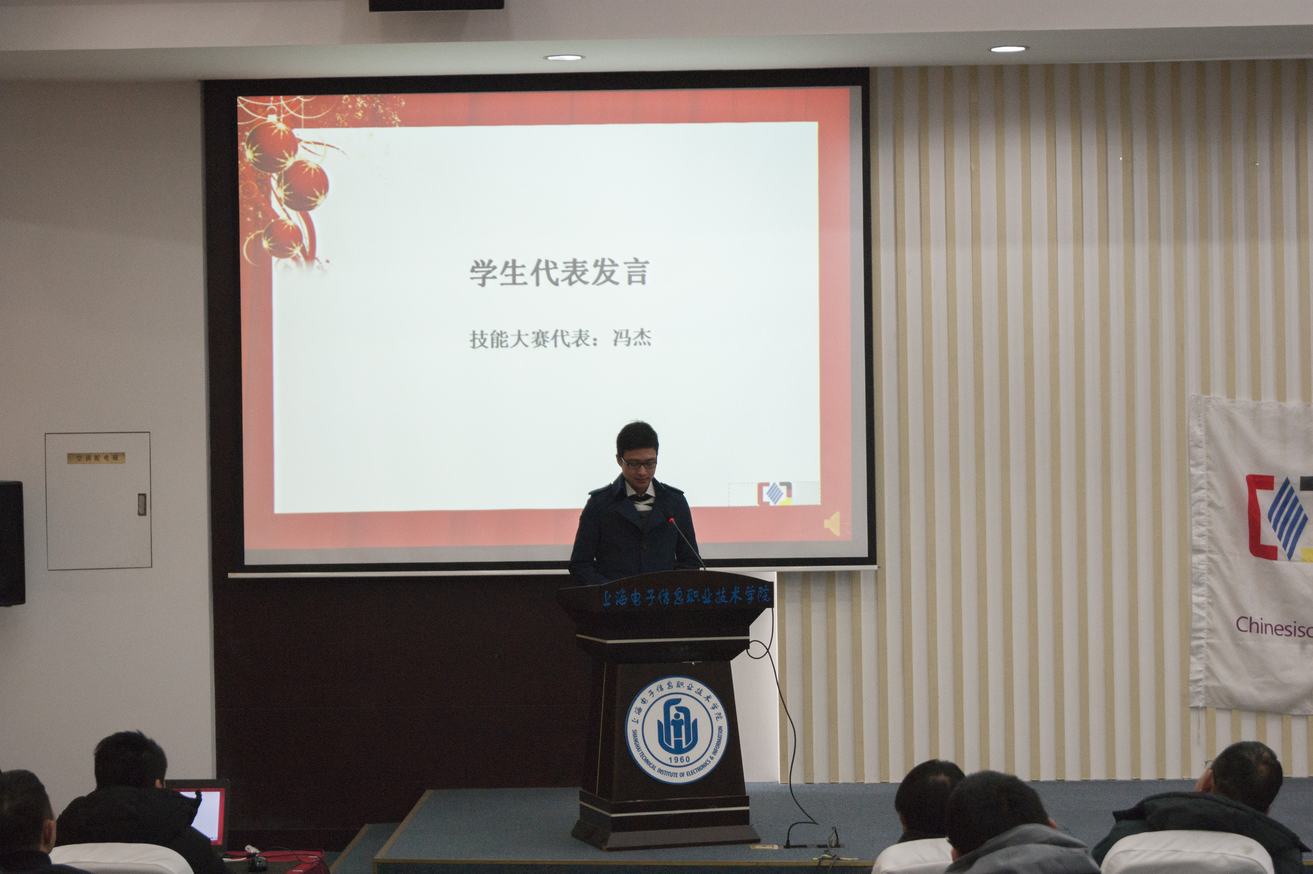 优秀团干和奖学金获得者学生代表卫一凡和技能大赛获奖者学生代表冯杰上台发言,卫一凡同学发言中的“勤能补拙,细心出事,团队至上”给在座团员青年以激励和希望,冯杰同学作为全国数学建模比赛一等奖、上海市数学建模一等奖,连续两年获得综合奖学金一等奖获得者的TS班学生代表把自己参加技能大赛所获得的收货和体会与大家分享,并鼓励同学们参加各类技能大赛来提升专业知识和技能。