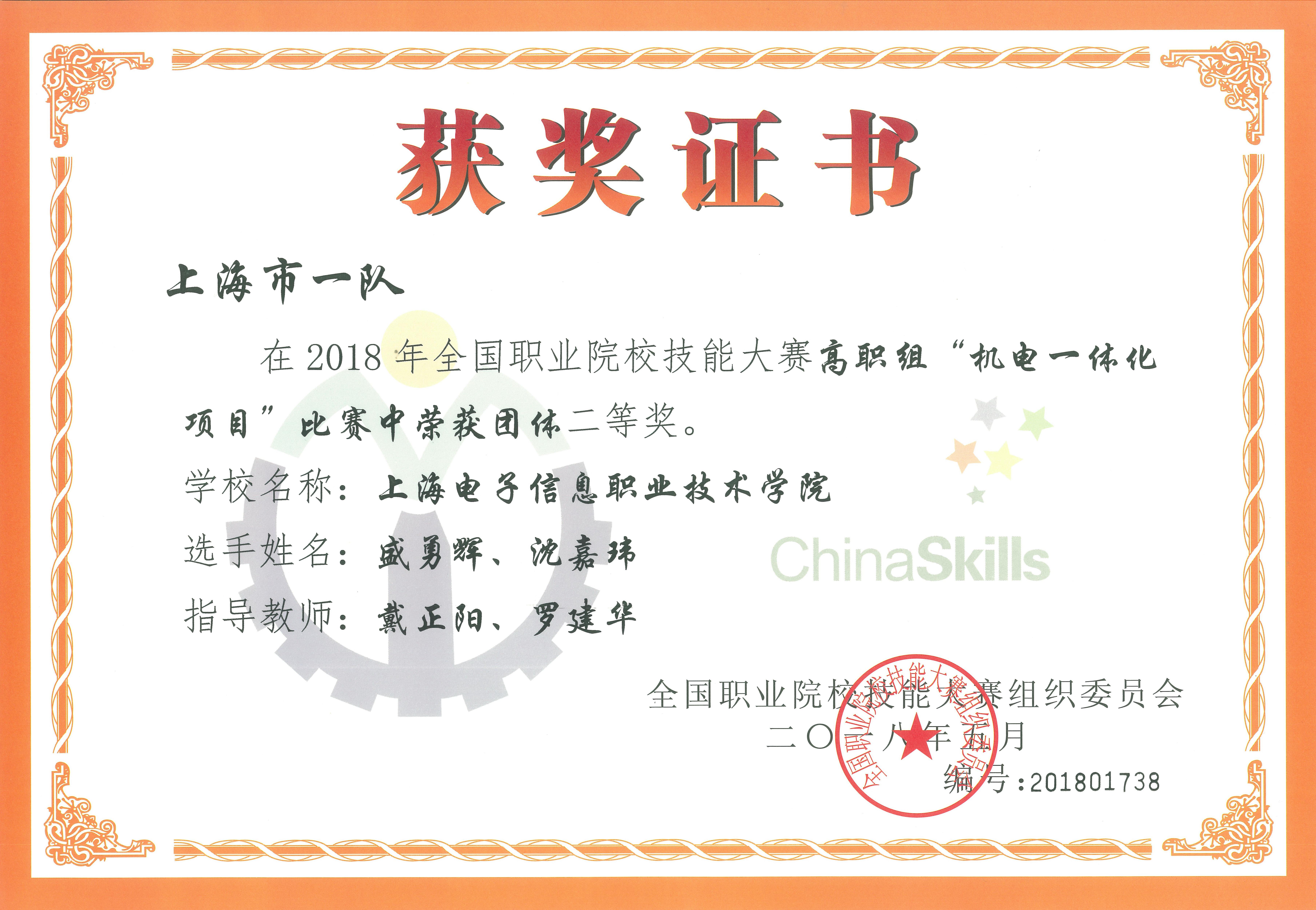 2018年5月4日-9日,在全国职业院校技能大赛天津赛区举行的比赛中,由我校中德工程学院学生盛勇辉、沈嘉玮,指导教师戴正阳、罗建华组成的代表队在全国职业院校技能大赛高职组“机电一体化项目”赛项中荣获团体二等奖!