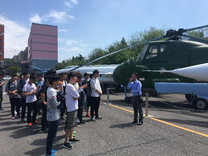 参观过程中,由讲解员为各班同学进行讲解。室外停机坪上,依次陈列着“东风”102歼击机、强-5超音速强击机、直-5直升机、歼-8E歼击机、歼-6超音速歼击机、乌米格-15歼击机教练机、歼-5喷气式歼击机、红旗2号地对空导弹等等。