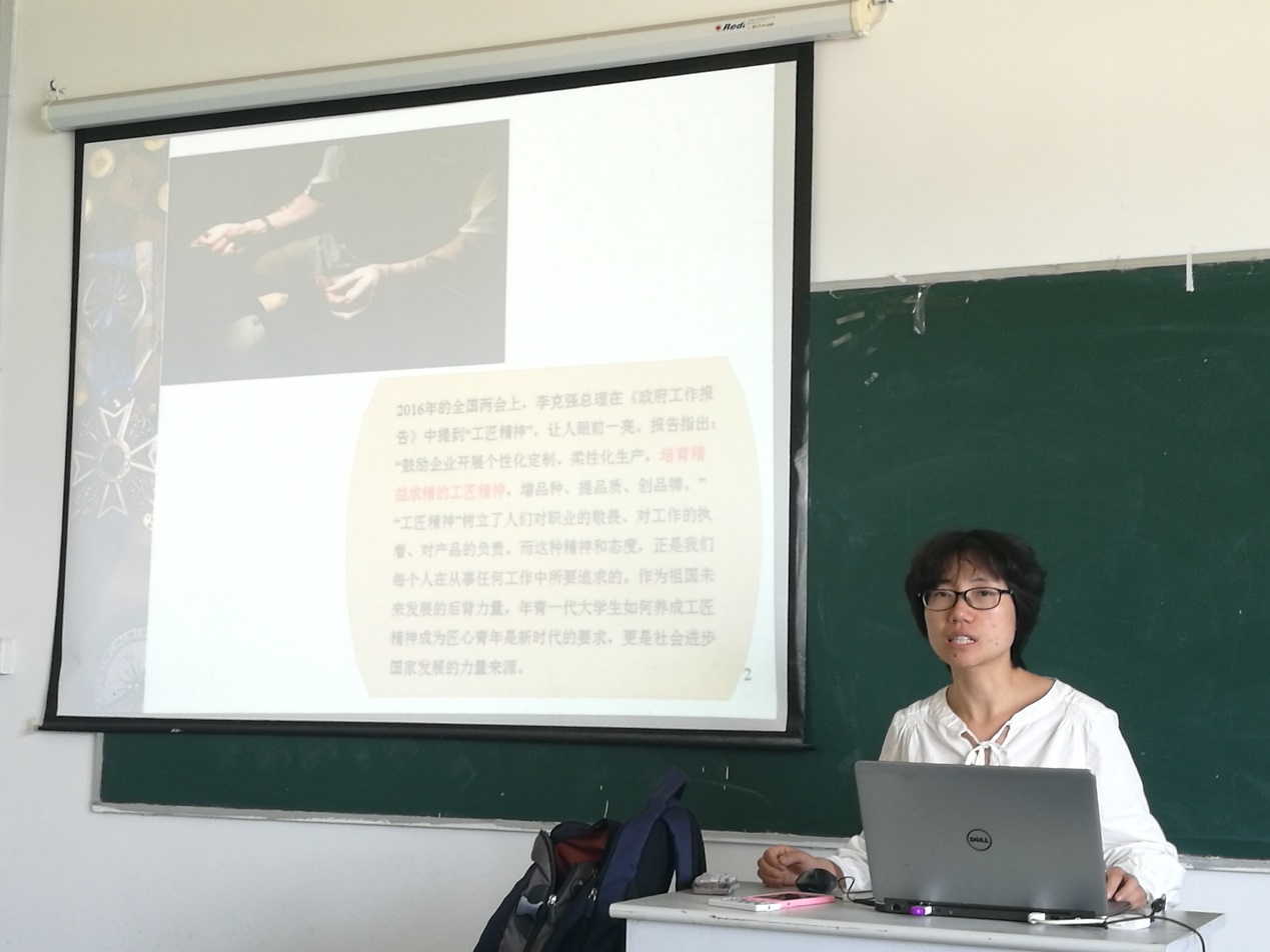 严老师首先阐释了工匠精神,工匠精神是2016年政府工作报告的新词。李克强总理在2016年《政府工作报告》中提出了“工匠精神”,所谓工匠精神就是干一行、爱一行、专一行,一辈子只干一件事,一辈子干好一件事,其实我们生活中有很多先进人物做到了精益求精的“鲁班”精神、持续专注的“卖油翁”精神、无私奉献的“孺子牛精神。那么我们为什么要弘扬工匠精神?因为国家需要具有工匠精神的一代大学生。我们国家虽然是制造业大国,但不是制造业强国,作为大学生只有传承工匠精神才能报效祖国。