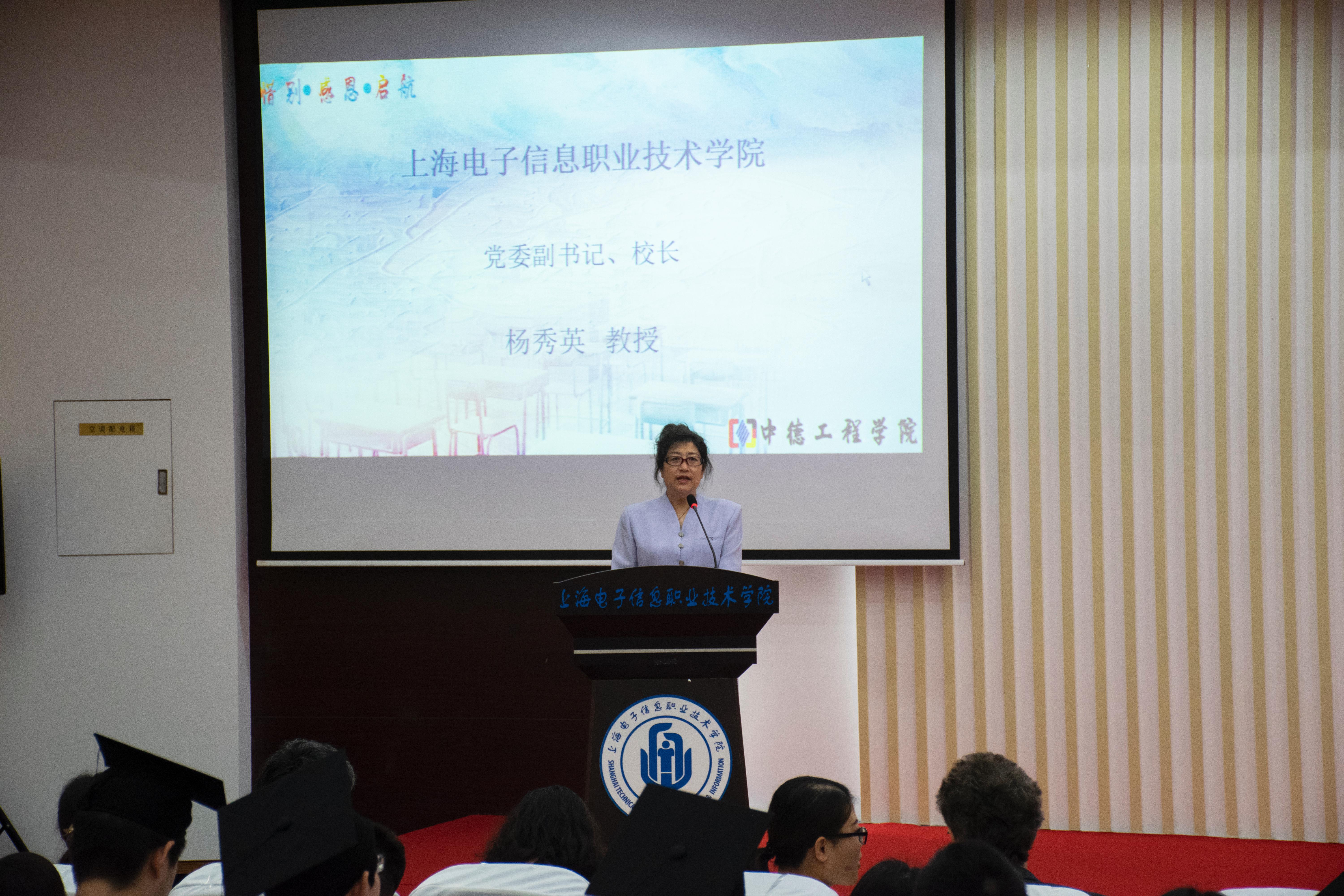 时光如白驹过隙,转瞬即逝。在这生机盎然,流光溢彩的六月,莘莘学子怀揣着青春的梦想迎来了人生中最难忘的毕业季。2018年6月5日上午上海电子信息职业技术学院中德工程学院在中德楼C108报告厅隆重举行了2015级TS班学成典礼。参加本次典礼的领导有:上海电子信息职业技术学院党委副书记、校长杨秀英教授,德国兰茨胡特应用技术大学Fritz Poernbacher 教授,上海电子信息职业技术学院窦争妍副校长、徐德明副校长、张涛副校长,以及各二级学院及二级部门的领导,中德工程学院全体教职工,2015级TS班学生及家长,2016级TS班全体学生和2017级学生代表。
