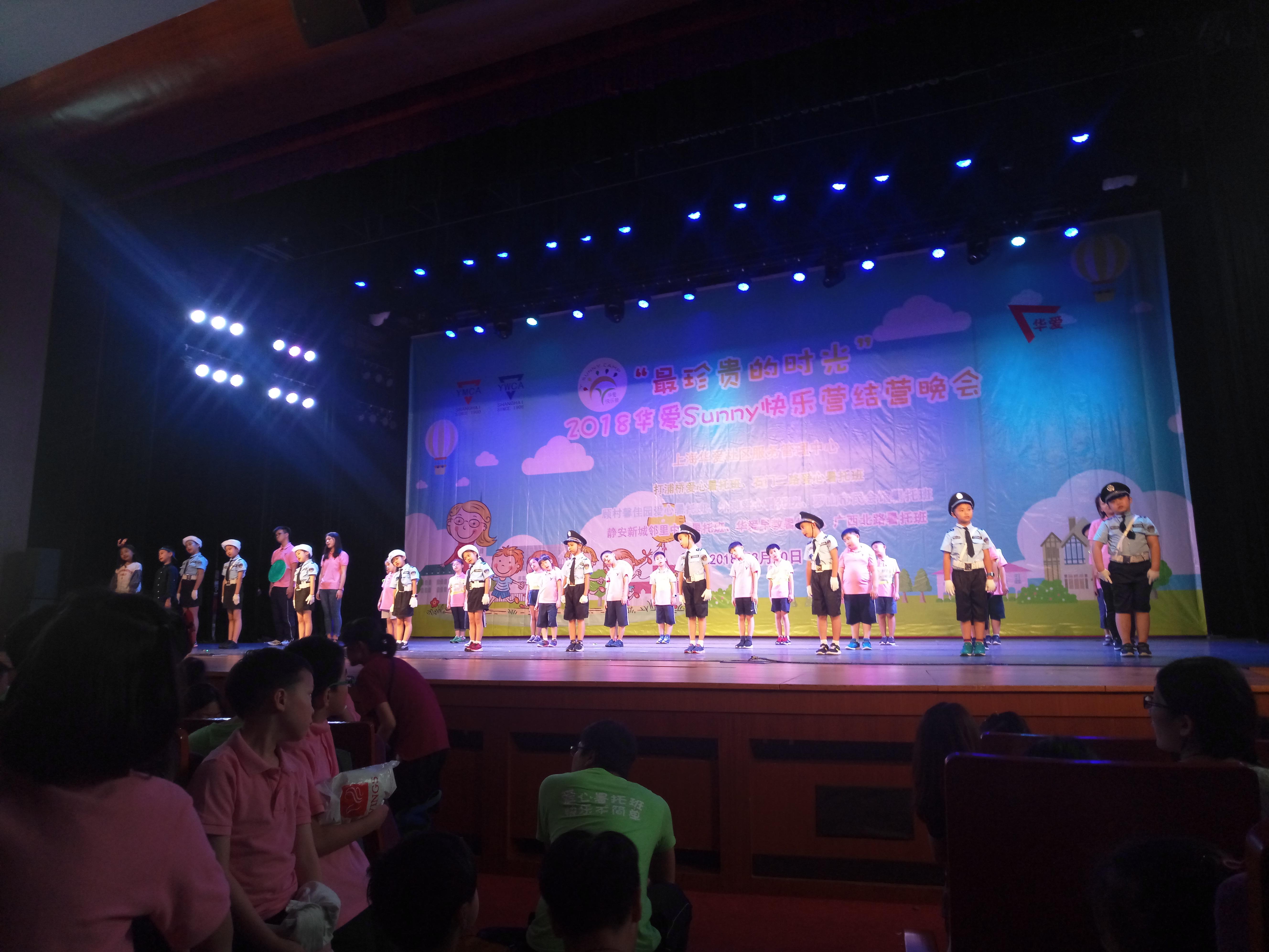 2018年8月30日下午,2018华爱SUNNY快乐营的结营式在重庆南路308号的白玉兰剧场如期举行,共有石门二路社区文化活动中心、打浦桥社区文化活动中心、顾村馨家园社区文化活动中心等7个中心参加了结营仪式。在中心老师和各位小营员的学习和努力下,演出节目精彩纷呈,汇聚了华爱7个服务点暑托班的成长与精华所在,不仅有我们石二的青蛙舞、打浦桥的古装话剧,还有顾村馨家园表演的小小交警等等。“台上三分钟,台下十年功”,台下家长们阵阵的掌声也是对小营员们暑托班两个月的学习和志愿者们的付出给予的最大肯定。