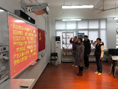 新发展的3名学生党员:张晨、胡信煌、徐康荣面对党旗进行集体宣誓,这是支部对预备党员进行的一次庄严、实际的党的观念的教育,是增强党性修养和党员意识的一次思想洗礼。新党员们作了铿锵有力的表态发言,最后,党总支副书记张峻颖同志作了总结讲话,对入党积极分子和新发展的党员提出了明确的要求和希望。党员们纷纷表示,今天的活动非常有意义,也是一次大胆创新。