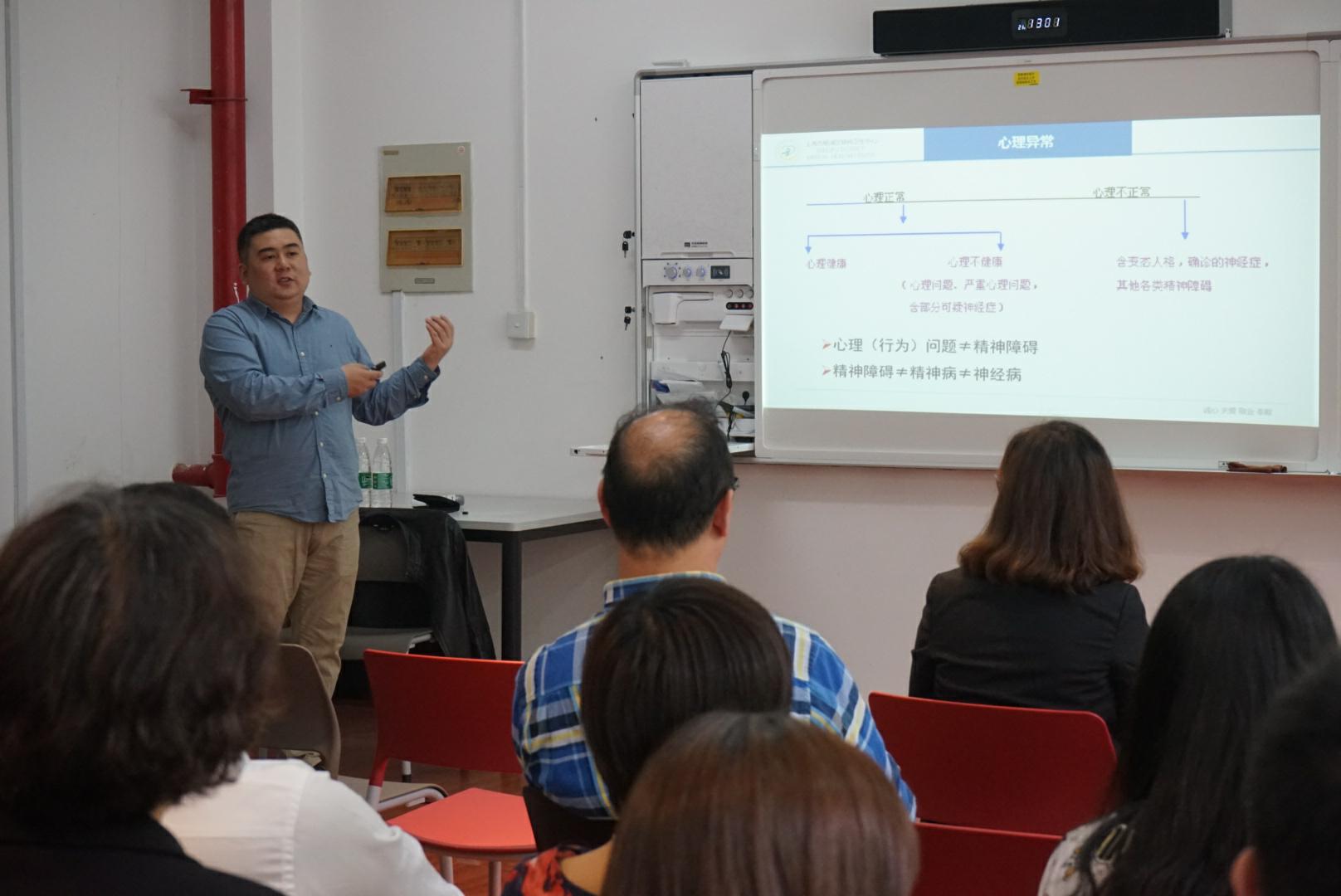 为深入贯彻落实全国高校思想政治工作会议及《高校思想政治工作质量提升工程实施纲要》精神,推动学校心理健康教育工作规范化和标准化建设,增强一线教职员工对心理危机发现的辨识能力。2019年4月24日下午,在学校心理咨询室的大力支持下,特邀杨浦区疾控精神卫生分中心常务副主任兼防治科科长陈优主治医师来校开展《大学生常见心理问题的识别》心理专题讲座。