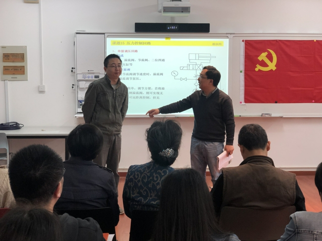 为认真学习贯彻落实习近平新时代中国特色社会主义思想、十九大精神和中央、市委关于推进“两学一做”学习教育常态化、制度化的部署要求,落实“三会一课”制度,结合全国和上海教育大会精神,中德工程学院党总支一直致力于政治学习教育与具体工作相结合,在模式创新方面进行大胆探索,积极实践。4月26日,中德工程学院党总支开展盲评式观摩党课活动。中德总支全体党员、党委组织部曾本聪部长、学校特邀党建组织员盛靖琪老师以及通信、机械、电子、经管、外语总支代表等参加。