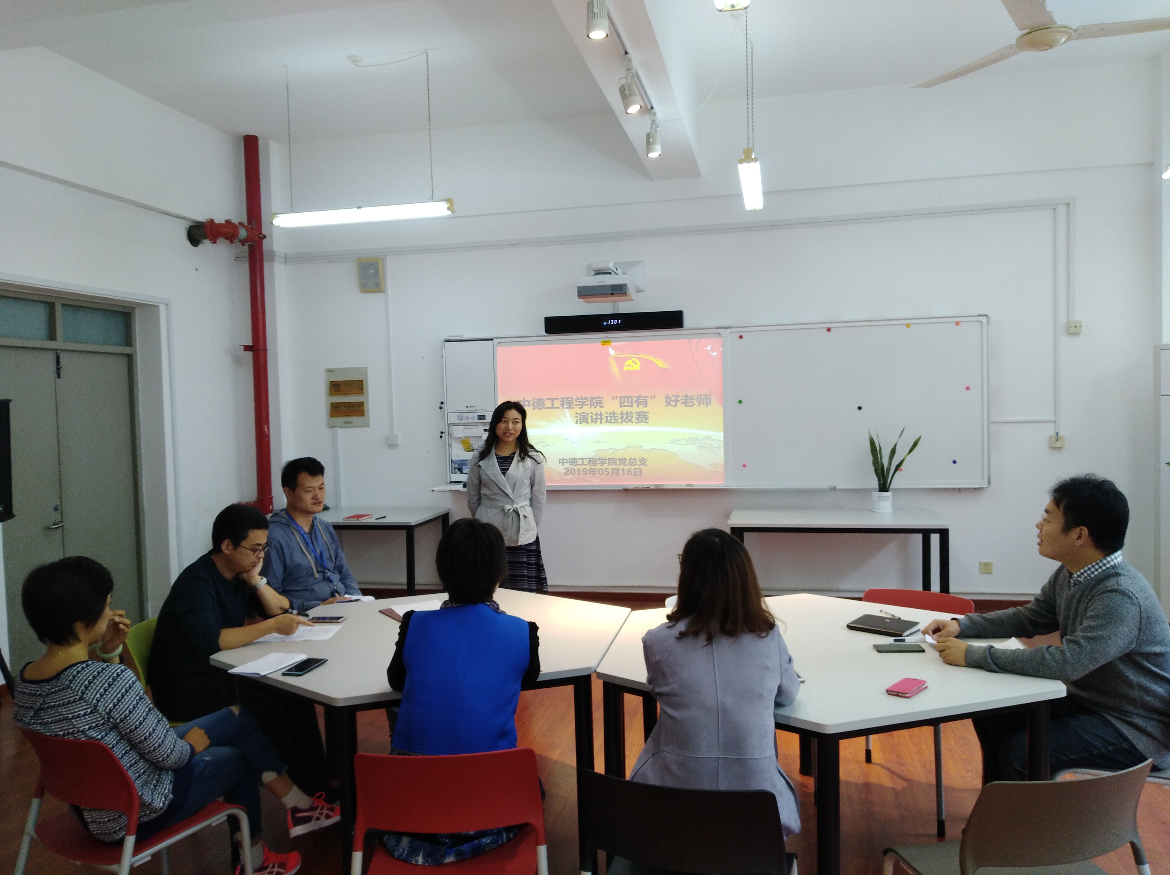为深入学习贯彻习近平新时代中国特色社会主义思想和党的十九大精神,落实全国教育大会精神和“三圈三全十育人”工作体系要求,坚持立德树人根本任务,加强师德师风建设,建设高素质教师队伍,以优异成绩迎接新中国成立70周年。5月16日,中德工程学院党总支在C105举办“四有”好老师演讲比赛选拔赛。选拔赛前,中德工程学院在各系部大力宣传,并开展二级部门的初赛,将比赛作为弘扬、塑造高尚师德师风、营造良好教风的重要形式。经过初赛有5位老师参加本次演讲选拔赛,5位老师围绕着:对“四有”好老师的理解、身边的“四有”好老师典型等歌颂先进、抒发情怀,演讲者精神饱满,营造了风清气正、和谐昂扬的育人氛围。(作者:徐济陆,供稿单位:中德工程学院党总支)