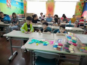 活动开始由社工给大家普及了端午节的由来、习俗以及爱国诗人屈原的故事,让大家详细了解了端午节的“粽子文化”,紧接着就是小朋友最兴奋的环节—— “手工小粽子”。不等中德志愿者把五彩的橡皮泥摆上桌子放好,小朋友们已经迫不及待的动起手来。为确保活动的有序开展和充分交流,大家在志愿者的引导下围成一个大圆,在家长的带领下小朋友们开始了“包粽子”。孩子们通过丰富的想象和灵巧的双手用五彩的橡皮泥认真而专注地塑造了形态各异的“粽子”。瞧,他们又揉又捏、又搓又压、橡皮泥经过他们精心的拼装、粘贴,一个个生动、形象、有趣的作品展现在大家眼前,活动现场充满了欢声笑语。