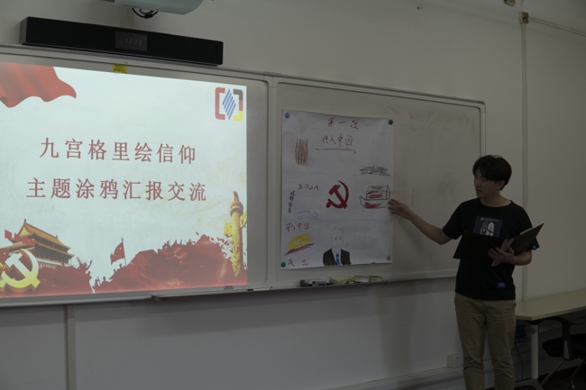 首先是九宫格里绘心中信仰主题涂鸦活动分组汇报,有的小组以中国共产党的诞生地为切入点,有的以中国共产党杰出领导人为切入点,也有的以十九大和科技创新为切入点等等。涂鸦活动是展现党课学习成果的立体表现形式,在其中看到了学员们认真勤恳的学习态度和团结合作的品质,也感受到他们对党的热情和向往。接着由学员代表吴炯同学发言,他分享了在党训班学习过程中的成长与体会,他呼吁,在新时代中国更加需要我们青年人的勇于奉献,承担起时代赋予我们的使命。千层之塔始于垒土,唯有坚定不移的跟党走的信念下严格要求自己,加强自身思想素质,为实现中华民族伟大复兴的中国梦不断奋进。