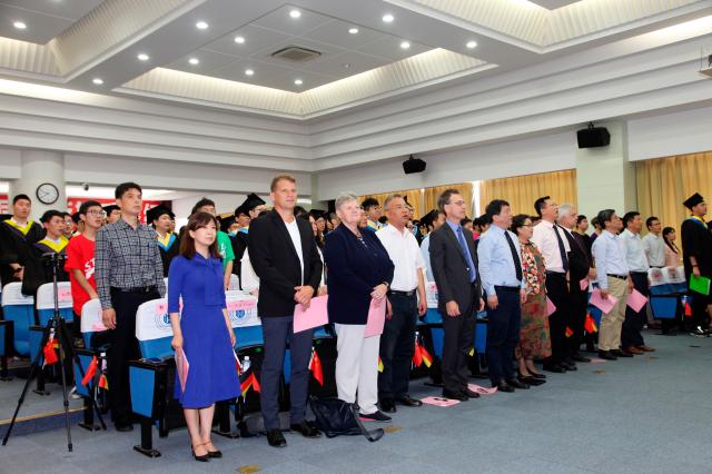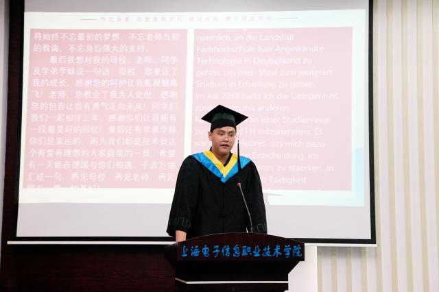 悸忆留夏,情谊永痕。2019年6月19日上午9点30分,上海电子信息职业技术学院中德工程学院、通信与信息工程学院、电子技术与工程学院2016级TS班学成典礼于C108报告厅隆重举行。上海电子信息职业技术学院党委书记田钦先生,党委副书记、校长杨秀英女士,党委副书记、副校长张涛先生,副校长徐德明先生,兰茨胡特应用技术大学电气工程系主任、海外名师珀恩巴赫教授(Fritz Poernbacher),帕绍技术员学校副校长君特尔·路德维希·霍尔策尔先生(Mr. Günther Ludwig Hölzl),代根多夫技术员学校副校长安吉拉·萨拉女士(Ms. Angela Saller),代根多夫技术员学校教师代表迪尔克·史迪格先生(Mr. Dirk Steger),各二级学院及二级部门领导,学校教师代表,2016级TS班学生及家长代表和2017级TS班学生代表共计200余人出席典礼。