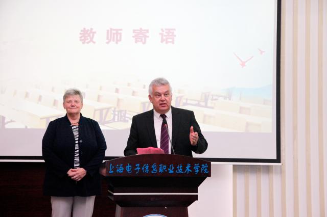 悸忆留夏,情谊永痕。2019年6月19日上午9点30分,上海电子信息职业技术学院中德工程学院、通信与信息工程学院、电子技术与工程学院2016级TS班学成典礼于C108报告厅隆重举行。上海电子信息职业技术学院党委书记田钦先生,党委副书记、校长杨秀英女士,党委副书记、副校长张涛先生,副校长徐德明先生,兰茨胡特应用技术大学电气工程系主任、海外名师珀恩巴赫教授(Fritz Poernbacher),帕绍技术员学校副校长君特尔·路德维希·霍尔策尔先生(Mr. Günther Ludwig Hölzl),代根多夫技术员学校副校长安吉拉·萨拉女士(Ms. Angela Saller),代根多夫技术员学校教师代表迪尔克·史迪格先生(Mr. Dirk Steger),各二级学院及二级部门领导,学校教师代表,2016级TS班学生及家长代表和2017级TS班学生代表共计200余人出席典礼。