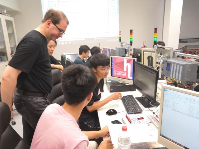 本周,我们上了SPS Grundlagen(西门子PLC控制技术),经过上周的设备熟悉,这周的课程学起来相对轻松很多,Welter教授给我们每个小组发了讲义和实验所需的器材,用PPT给我们讲了课程的内容,同学们听的都非常认真,理论后续教授让我们通过对课程的理解,先自己动手完成实验,我们边做边研究,虽然一开始有些磕磕绊绊,但通过努力我们都顺利完成了实验。在这基础上,教授提出了更高的要求,让我们用不同的方法尝试完成实验,我们经过探讨、尝试、研究,但还是离成功差一步,最后在教授的点拨下茅塞顿开,成功地找到了多种方法完成实验,受到了Welter教授的赞扬。