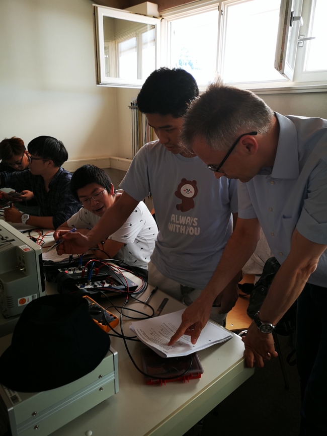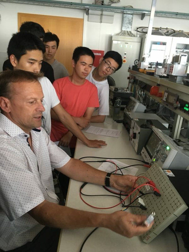 兰茨胡特应用技术大学安排的课程内容难度适中,知识面覆盖全面,理论与实践紧密结合。在各项的学习课程中,教授和助教以严谨的教学态度为学生们树立了榜样。学生们也通过自己的努力,克服了德国的高温天气,对各项课程有了全新的掌握与认知。在能源技术课程中,学生们了解到了能源技术在生活和工业中应用的各种实例;在互联网协议的课程中,学生们学习了互联网的连接结构,连接方式;在PLC实验室,学习了西门子PLC的程序编写和电路搭建;在NAO机器人课程中,学生们掌握了机器人编程的方式方法;在物联网技术和微控制技术课程中,学生们对智能家居的设计和编程有了全面的了解;在混合电路技术课程中,学生们在助教的带领下,完整体验了从芯片的布局设计到印刷电路板的刻制,再到芯片的气焊组装的产品制作全过程。这些都让学生们对所学课程产生了浓厚的兴趣,也对学习的过程有了更直观的理解与掌握;在德语与文化课(Deutsche sprache und kultur)中,德语老师Chris Thalgott借助各种形象的道具和游戏,并通过幽默的肢体语言,让整个课堂变得生动有趣,充满欢乐。