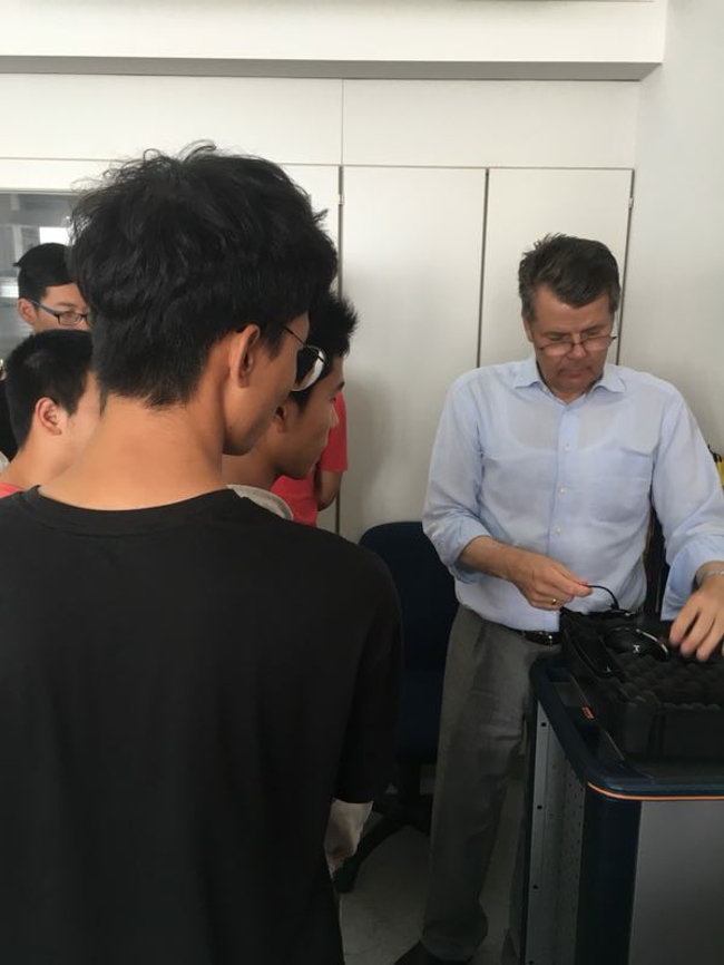 兰茨胡特应用技术大学安排的课程内容难度适中,知识面覆盖全面,理论与实践紧密结合。在各项的学习课程中,教授和助教以严谨的教学态度为学生们树立了榜样。学生们也通过自己的努力,克服了德国的高温天气,对各项课程有了全新的掌握与认知。在能源技术课程中,学生们了解到了能源技术在生活和工业中应用的各种实例;在互联网协议的课程中,学生们学习了互联网的连接结构,连接方式;在PLC实验室,学习了西门子PLC的程序编写和电路搭建;在NAO机器人课程中,学生们掌握了机器人编程的方式方法;在物联网技术和微控制技术课程中,学生们对智能家居的设计和编程有了全面的了解;在混合电路技术课程中,学生们在助教的带领下,完整体验了从芯片的布局设计到印刷电路板的刻制,再到芯片的气焊组装的产品制作全过程。这些都让学生们对所学课程产生了浓厚的兴趣,也对学习的过程有了更直观的理解与掌握;在德语与文化课(Deutsche sprache und kultur)中,德语老师Chris Thalgott借助各种形象的道具和游戏,并通过幽默的肢体语言,让整个课堂变得生动有趣,充满欢乐。