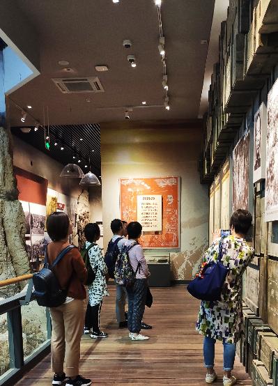 14日上午,历经3个小时的车程,团队成员来到南梁,首先参观南梁革命纪念馆。整个建筑群分四组。第一组为门洞,门洞上有凉亭,进洞有石牌坊门。第二组为碑亭、纪念碑和群雕,碑高达34.117米,碑身正面镌刻着胡耀邦同志题写的“革命烈士永垂不朽”八个大字,纪念碑东侧是显示陕甘边区军民英雄气概的白色群雕,西侧是清音楼。最后面是陕甘边区苏维埃政府旧址,内有3个革命文物展览室,分别陈列有毛泽东、周恩来、朱德等同志的题词,刘志丹等烈士的生平简介及部分遗物;再现陕甘边区革斗争史的文字、绘画、图片及实物;方毅、马文瑞、汪锋等39名中央、省上领导及当年在南梁地区战斗过的老前辈的题词。纪念碑后是立体群雕,高4米。第三组是清音楼,恢复原荔园戏楼,并增建了一座凉亭。第四组为展厅,分三部分陈列,第一部分是南梁革命烈士简介及画像;第二部分陈列着革命文物及南梁革命史;第三部分陈列领导题词。