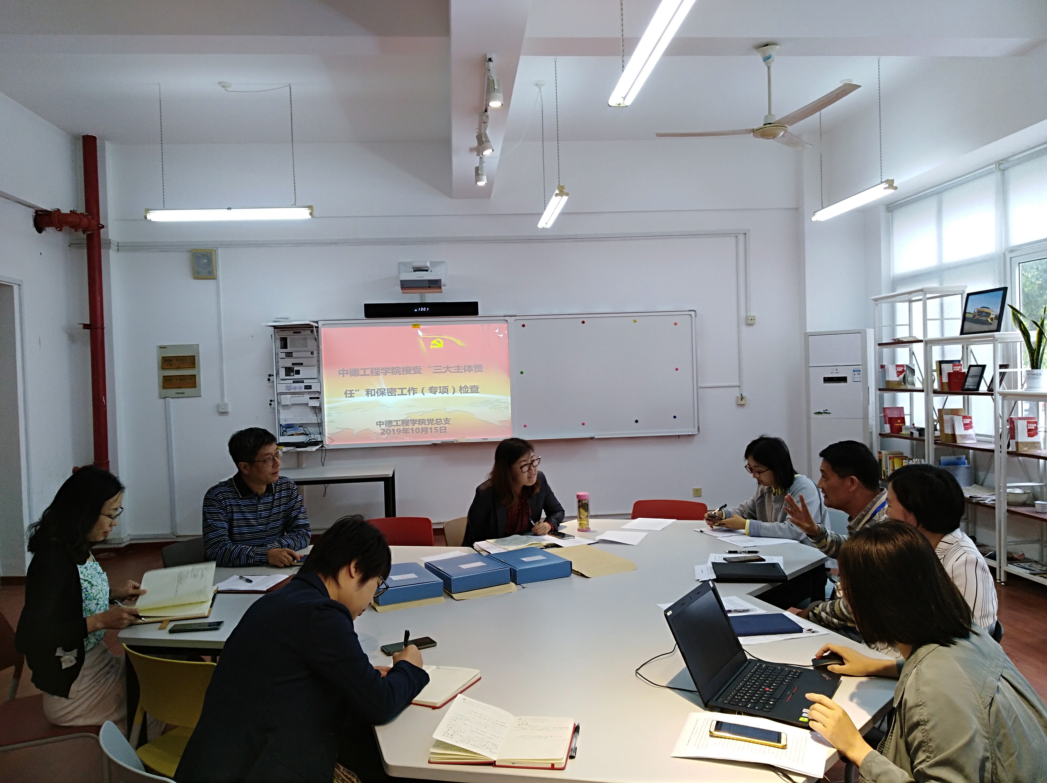 检查组一行通过听取汇报、访谈、个别谈话等形式了解中德工程学院落实“三大主体责任”和保密工作开展情况进行专项检查,检查组分头查阅中德工程学院在意识形态、党风廉政、基层党建和保密工作台账等方面执行情况。