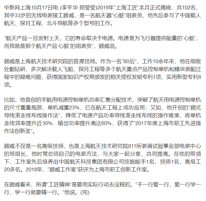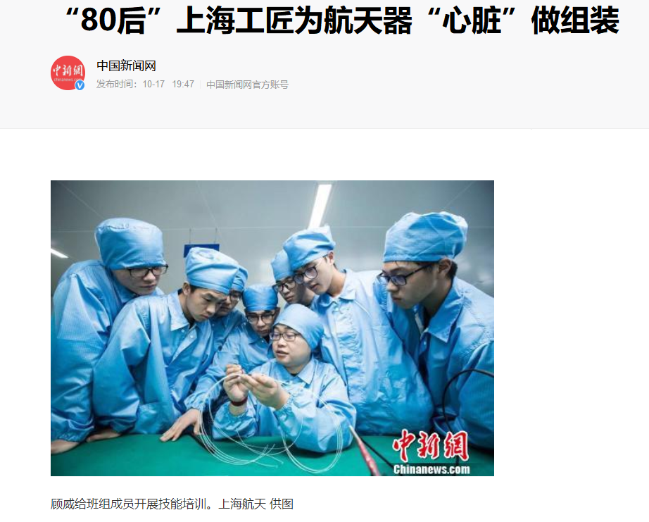 中国新闻网以《“80后”上海工匠为航天器“心脏”做组装》为题做了专题报道。