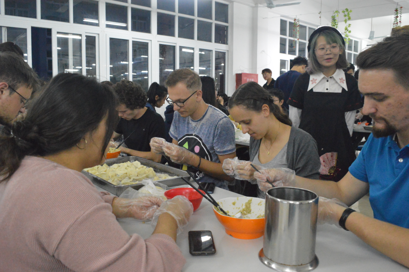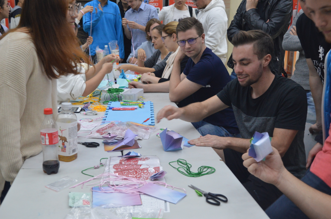 本届文化周受到我院师生的高度重视,更是提前几个月开始酝酿、策划以及创建。1021日第四届中德文化周开幕式在I402多媒体教室如期举行,活动从观看中德工程学院第三届中德文化周短片开始,以大合唱《我爱你中国》结束,期间不论是慷慨激昂的朗诵还是风趣幽默的相声,都无一不深动诠释着本届文化周的大主题“峥嵘70载,共圆中国梦”。1022日在F211的新一届团学干部破冰团建,旨在通过一个个有趣的小游戏来打破彼此间的陌生感,在提升各部门新生之间的沟通与联系的同时,也为中德工程学院今后团学工作的顺利开展打下牢固的人力基础。1023B楼大厅举行的中国民间艺术交流活动从民俗特色、传统文化等入手,呈现了中方优秀传统文化的独特魅力与内涵。随后围绕活动主题开展的文墨和手工这两个版块活动,成功地把德国友人带入到华夏文化享受和体验当中,无论是书法笔锋的苍劲有力,又或是折纸及绳结的传统艺术,均吸引德国友人的长久驻足。1024食堂二楼开展的每“食”每刻之中德美食文化交流活动,通过德国学生介绍的餐桌礼仪、日常饮食、特色美食等,不仅为我们展现了感官上的诱惑,更是中、德餐桌文化在台上的一次激烈对碰。而中华传统美食的手艺展示及现场教学使整个活动氛围达到了顶峰,虽然两国学生之间交流有着语言的不便,但这并不影响同学们的热情,活动现场人头攒动、欢声笑语、其乐融融。