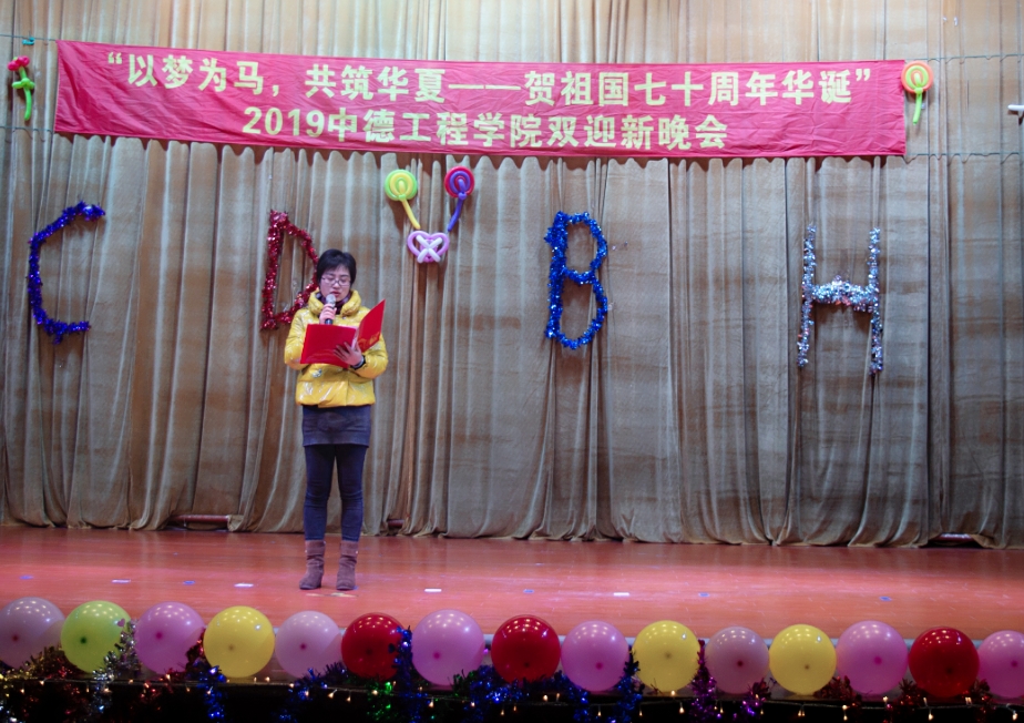 晚会伊始施云美老师上台致开幕词,从团学活动、技能竞赛等方面回顾了本学年中德工程学院开展的各项重要活动,强调了我院以活动平台为载体,营造浓郁的学习氛围和育人环境,着重提升学生的自身修养、思想道德及精神文明建设,同时注重与国际的文化交流,将中、德两国优秀文化互通互融,从而促进学校文化素养和文明内涵的全面提升。