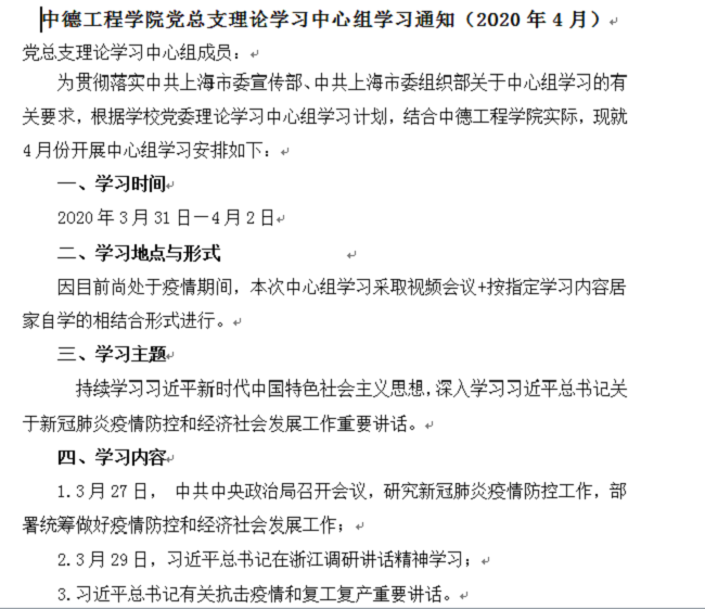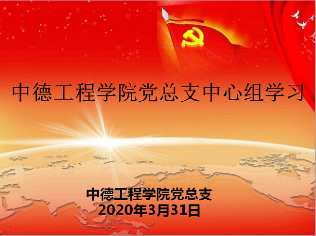 为贯彻落实中共上海市委宣传部、中共上海市委组织部关于中心组学习的有关要求,推进中心组成员不断在学懂弄通做实上下功夫,切实增强“四个意识”,坚定“四个自信”,做到“两个维护”,着力深化党的理论创新成果的学习与实践,中德工程学院中心组按照年度学习计划于3月31日开展线上理论学习会,会议由张峻颖书记主持,中心组全体成员参加。
