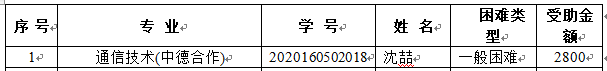根据《上海电子信息职业技术学院国家助学金评审办法》及《关于做好2020-2021学年国家助学金评定工作的通知》的要求,经学生本人申请、班级评议小组民主评议、辅导员推荐、中德工程学院学生资助工作小组对申请学生进行综合考评,拟在中德工程学院名额额度范围内推荐沈喆等同学申报2020-2021年度国家助学金。现将推荐申报名单公示(更正)如下: