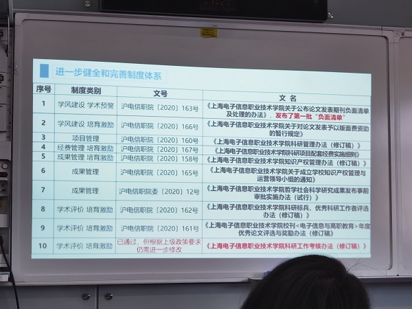 科研处汤琦老师就《电子信息与高职教育》校刊投稿录用流程和科研项目归档常见问题作了专题讲解,介绍了校刊工作的新变化和新发展,强调了科研项目归档工作的重要性,并和老师们交流了工作经验。