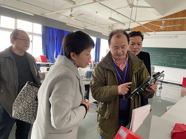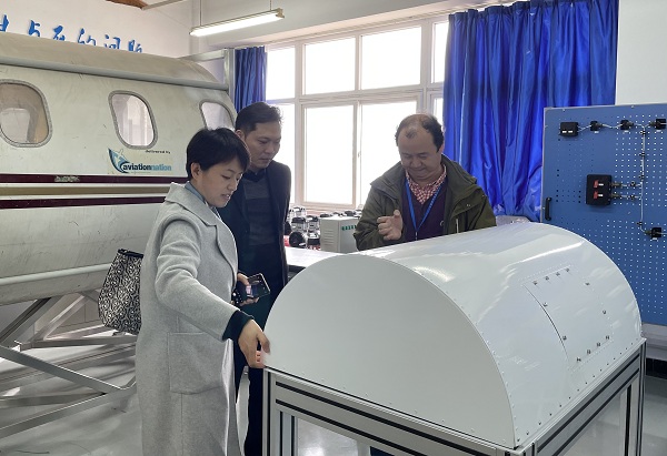 在党总支副书记、航空系主任孟秋静、航空系专任教师谢敏陪同下,张玉副院长一行参观了中德工程学院实训室及校企合作飞机电子电气装配实训平台,并详细了解了学院航空系专业建设、发展、学生培养、实训室运作等情况。