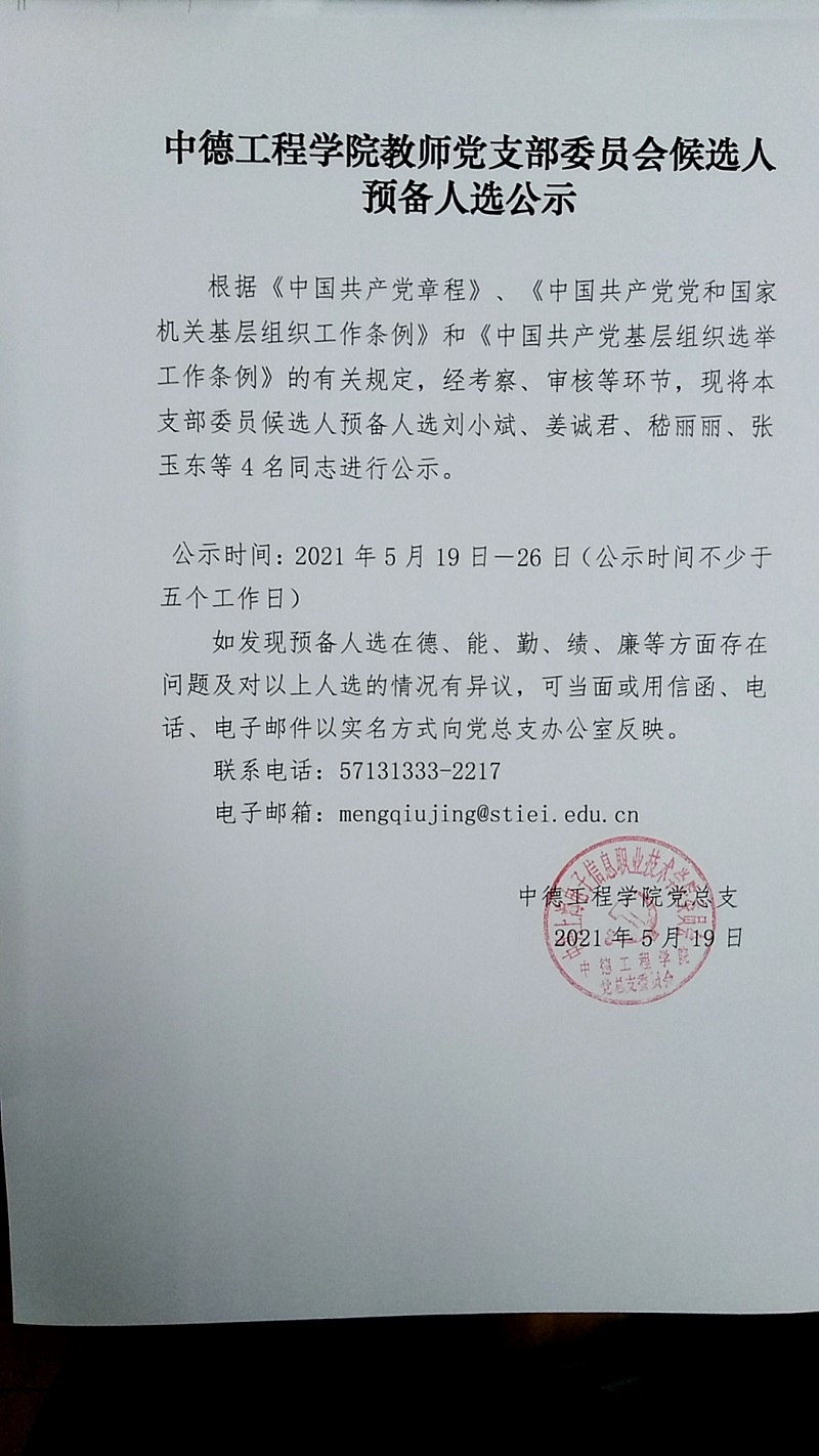 中德工程学院教师党支部委员会候选人预备人选公示