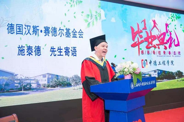 德国汉斯•赛德尔基金会上海代表处首席代表、中德合作项目负责人施泰德先生寄语毕业学子,在当今日新月异的时代,走向工作岗位的同学们要保持终身学习的态度,不懈努力,勇于担负起自己的责任,做一个对社会有贡献的人。