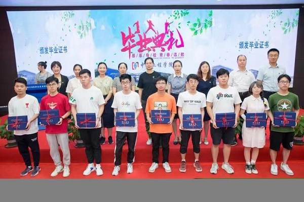 教务处副处长王西贝、学工部副部长栾文飞、学院党政领导、教师代表向2021届学生代表颁发毕业证书。