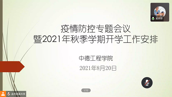 8月20日上午,中德工程学院召开线上疫情防控专题会议暨2021年球季开学工作安排会议,中德工程学院全体教工参加,会议由黄婷婷副院长主持。
