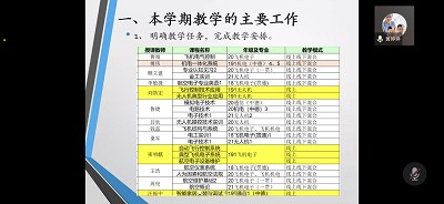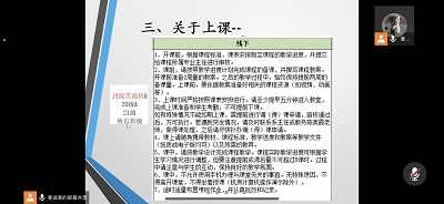 会上,教务主管姜诚君就本学期的教学工作做了解读,主要包括教学任务、教学形式、教学规范、课程考核和评价等,同时现场演示了在线教学平台的使用方法,并就线上教学中课程资源建设、课程论坛互动、课堂作业布置批改、教学计划、教案和教学后记填写等做了重点讲解。