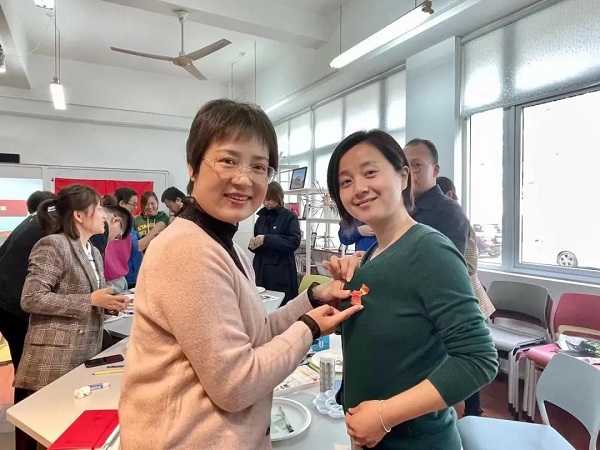 活动最后,为感谢设计与艺术学院党员教师与学生对本次主题党日活动的大力支持,中德工程学院学生党支部向设计与艺术学院直属党支部赠送了学院师生为庆祝建党百年特别设计的纪念徽章,表达我心向党,不忘初心,感念党恩,传承精神的决心,并一一为师生们佩戴上纪念徽章。