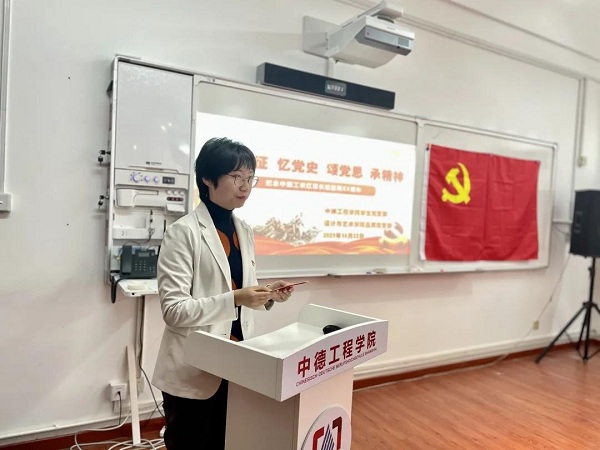 中德工程学院学生党支部书记严卫华也为师生们带来了红军长征途中《九个炊事员的故事》,讲述了长征途中面临粮食短缺、物资匮乏的恶劣环境下,红军战士甘于牺牲自我的伟大革命精神,让师生们更深刻地感受到红军战士坚定的理想信念,以及默默奉献,勇于牺牲的崇高精神。