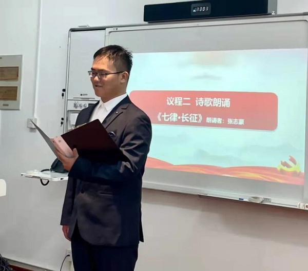 中德工程学院入党积极分子张志豪同学为师生们带来诗朗诵《七律·长征》: