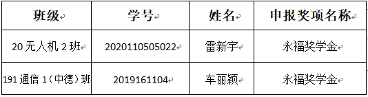 根据《上海电子信息职业技术学院永福奖学金、永福助学金评定实施办法》文件及《关于做好2020-2021学年永福奖学金评选工作的通知》的要求,经学生本人申请、辅导员推荐、中德工程学院学生资助工作小组对申请学生进行综合考评,拟推荐2名同学申报永福奖学金。现将推荐申报名单公示如下: