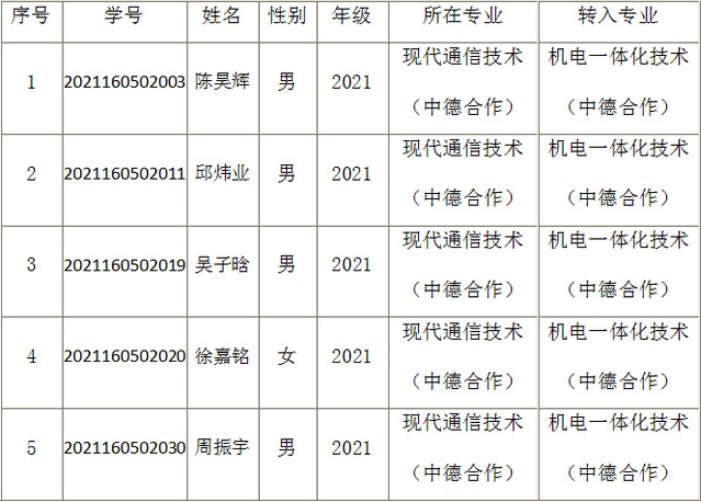 2021-2022学年第1学期2021级现代通信技术(中德合作)专业学生参加德方考试,并通过中德工程学院考试委员会审核,拟同意陈昊辉等5名同学(具体名单见附表)由现代通信技术(中德合作)专业转入机电一体化技术(中德合作)专业,现将名单予以公示,公示期为五个工作日(2022年1月25日至2022年1月29日)。如有异议,请在公示期内向学校监察室反映,联系人:田老师,联系电话:57132760。
