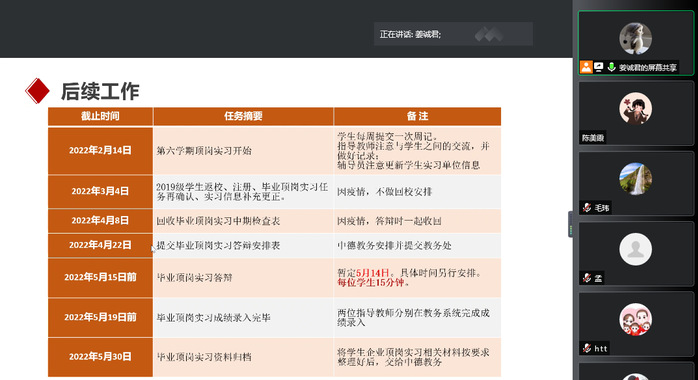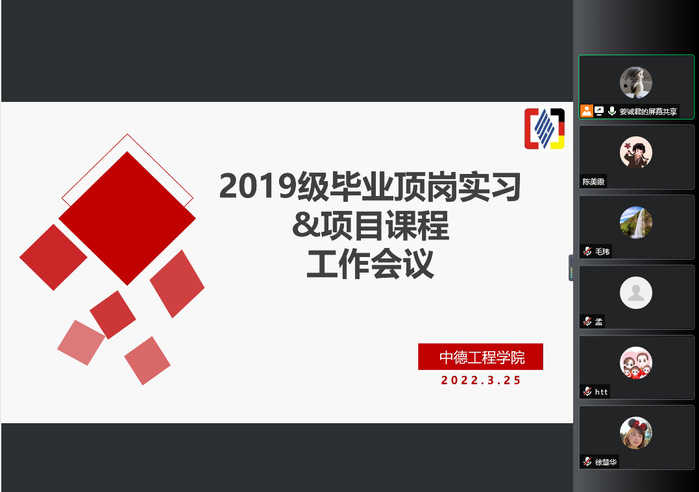 在抗击疫情的特殊时期,中德学子不畏艰难,坚守在自己的实习岗位上。为进一步做好2022届毕业生顶岗实习和项目课程指导工作,中德工程学院于3月25日召开线上会议,研究并部署相关工作内容。本次会议由中德工程学院副院长黄婷婷主持,党总支副书记、副院长施云美、教学管理办公室主任姜诚君、全体指导教师、毕业班辅导员等参加。