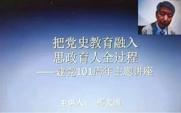 讲座中,邢老师从善用党史“教科书”上好育人大课堂为开题,向大家介绍了中国共产党一百多年的光辉历史,让大家“走进历史时空、品读峥嵘岁月”。他的讲演以极其丰富的信息量和知识点,使大家在短时间内就了解和掌握党的百年史概况。而后,邢老师以党史为切入点,和大家交流了如何在课堂中让学生获得最大的党性教育与精神感染,将党史教育融入思政课程;同时以学科历史为背景,将党史融入课程思政,从而实现“思政课程”和“课程思政”的同向同行。邢老师以高度的概括手法,不仅在“云”上讲了一堂生动的党史课,同时,给在场听众老师很大的思政教育启发。