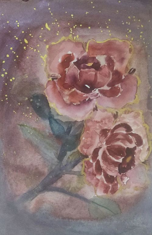 陈乐:以植物花卉来模拟心理状态,我自认为自己的心理状态还好,所以花朵是盛开的状态。画中花周围的金色小点代表着愿意和身边的人分享开心的事情,也愿意聆听情绪低落的朋友诉说心事,陪她们发泄情绪。