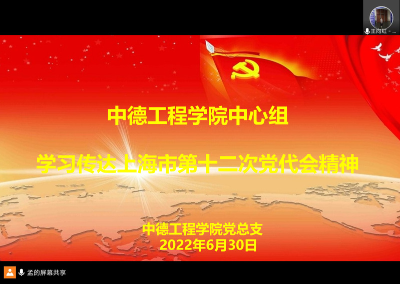 6月30日上午中德工程学院中心组在云端集中学习上海市第十二次党代会精神,大家集体学习了上海市委书记李强代表中共上海市第十一届委员会向大会作题为《弘扬伟大建党精神践行人民城市理念加快建设具有世界影响力的社会主义现代化国际大都市》的报告,大家热议上海市第十二次党代会报告。