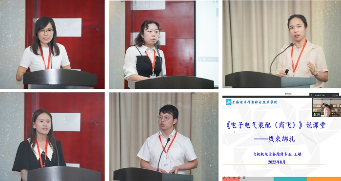 “说课程”赛项:孙文峰《电工技术》、刘长春《航空概论》、赵伟文《机电设备电气控制与维修2》、徐慧华《信息技术1》。