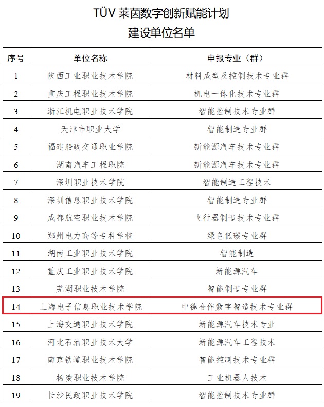 学校中德工程学院是教育部立项、上海市教育委员会备案的中德政府间合作办学项目。学院设有机电一体化技术(中德合作)、数字设计与制造技术、飞机电子设备维修、飞机机电设备维修、无人机应用技术五个专业,中德合作专业采用中德双方共同拟定的人才培养方案。通过“TÜV莱茵数字创新赋能计划”的实施推进将进一步提升我校国际化技术技能人才培养的能力和水平,助力上海区域经济社会发展。