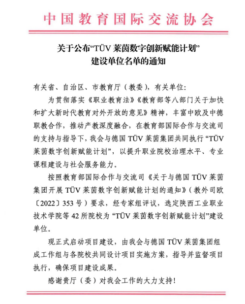 “TÜV莱茵数字创新赋能计划”是在教育部指导下,由中国教育国际交流协会联合德国TÜV莱茵集团共同开展的产教融合创新试点项目。该计划聚焦智能制造、新能源汽车、绿色低碳三个专业领域,以创新性“企业服务—人才赋能—院校赋能”产教融合模式,对标数字化转型背景下国际产业标准和人才培养标准,助力职业院校增强“双师型”教师素质,提升数字化综合治理水平,研制国际通用的专业标准,提高人才培养的能力和水平,推进校企协同创新和成果转化。