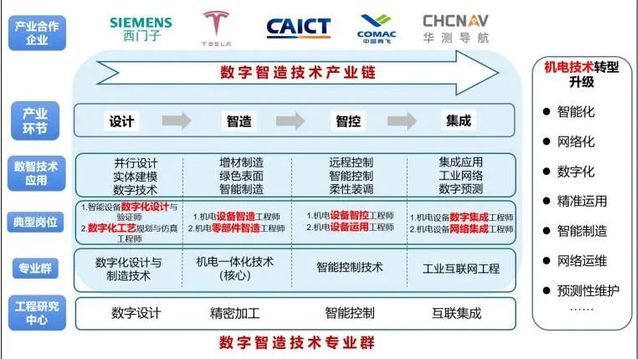 中德合作数字智造技术专业群,对接上海三大先导产业和六大产业集群的数字智造技术产业链,契合上海临港所需的“设计、智造、智控、集成”岗位群,以数字智造技术应用为主线,以机电一体化技术(中德合作)(智造)为核心,工业互联网工程(集成)为骨干,数字化设计与制造技术(设计)和智能控制技术(智控)为支撑,构建对接产业、提供人才和技术支撑的专业群。